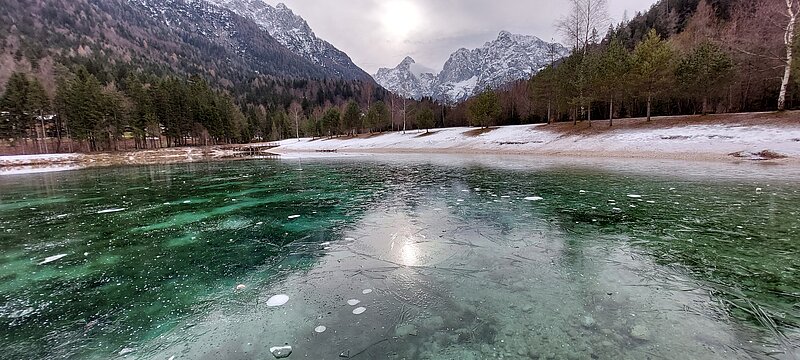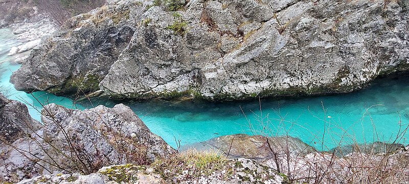 Ein Erlebnis der anderen Art war dann die Fahrt nach Kranjska Gora zum Jasna-See. Diese unglaubliche Klarheit des Wassers und das ebenso klare Eis drauf waren schon sehr speziell. Über Pass-Strassen gelangten wir dann kurz nach Italien, wo ich eine Nacht am Lago Predil verbrachte und ein Wildschwein-Gulasch genoss. Über weitere Pass-Strassen wieder zurück nach Slowenien. Schon wieder ein Highlight: die Soca-Schluchten bei Bovec müssten für alle ein Ziel auf der Bucketliste sein! Diese türkisene Farbe des Wassers, das sich durch tiefe Schluchten mit fast senkrechten Felswänden windet > einfach unbeschreiblich! Schaut Euch das Reel auf Facebook und Instagram an und überzeugt Euch selbst. Selbst an einem Regentag, wie damals, ist das einfach so schön, dass mir die Worte dafür fehlen.